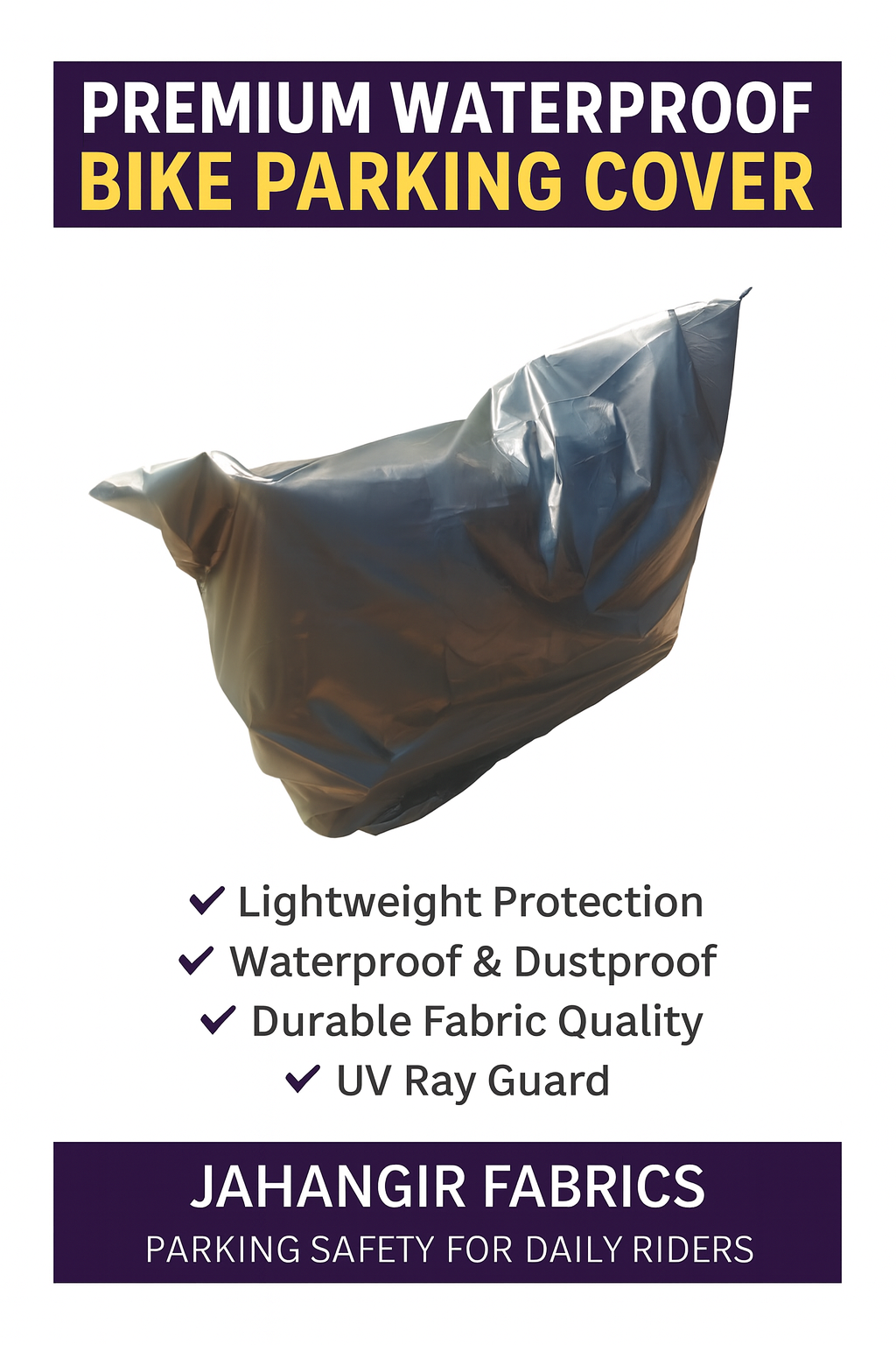 Protect your motorcycle from dust, rain, sunlight, and scratches with the Jahangir Fabrics Premium Waterproof Bike Parking Cover.